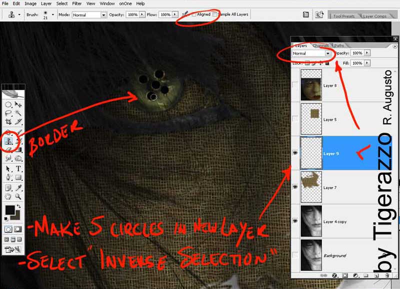 6-To create a new layer, to make 5 circles on the eye (they will be the holes of the future button), soon to select them and to revert the selection. Next, with the Clone Tool you can do it like the example, by the edge (the selection is hidden 'cause you can see the result)
